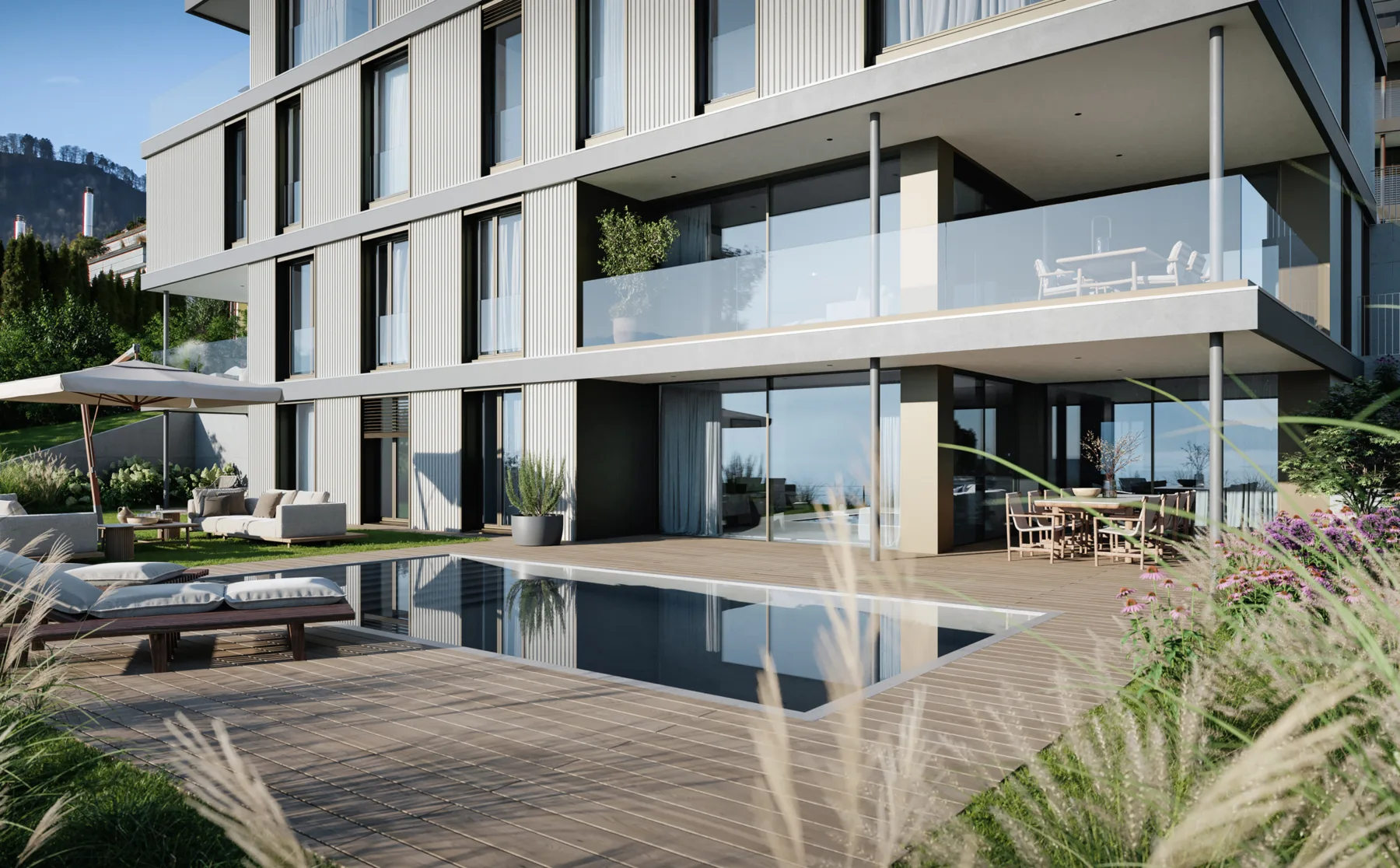 Zusätzliche Nutzräume wie Reduit, private Waschküche, Keller sowie ein Technikraum für die moderne Poolanlage runden das Angebot ab. Der Aufzug und die kontrollierte Wohnungslüftung sorgen für zusätzlichen Komfort.