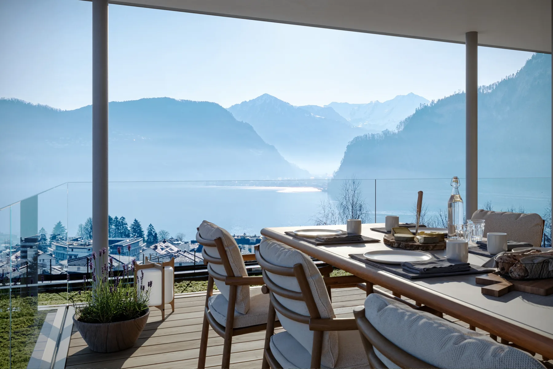 Bereits das einladende Entree vermittelt Grosszügigkeit und leitet harmonisch in den offen gestalteten Wohn-, Ess- und Kochbereich über. Dieser beeindruckt mit über 70 Quadratmetern Fläche, grossflächigen Fensterfronten und direktem Zugang zu den beiden Terrassen – die perfekten Orte für entspannte Stunden oder gesellige Abende.