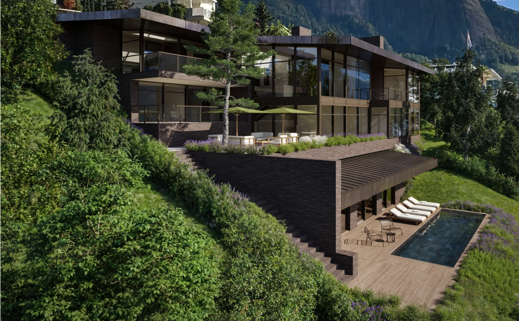 Das präsentierte Villenprojekt erfüllt höchste Ansprüche und fügt sich harmonisch in das Gelände ein. Am Kastanienweg gelegen, ist die bestehende Liegenschaft im Chaletstil der Ausgangspunkt für das neue Bauvorhaben. Die geplante Villa erstreckt sich über zwei grosszügige Wohngeschosse, die alle mit einem atemberaubenden Blick begeistern und als «Splitlevel» also halbgeschossig konzipiert sind und sich der Neigung des Geländes anpassen. Es erwartet Sie eine exklusive Wohnlandschaft, teilweise mit beeindruckender Raumhöhe und viel Platz für individuelle Gestaltung. Auf der darunterliegenden Etage befinden sich grosszügige Schlaf- und Büroräume. Eine offen gestaltete Treppenanlage verbindet die Geschosse miteinander. Attraktive Aussenbereiche, die als Gartenflächen, gedeckte Terrassen oder Loggien gestaltet sind, werden durch einen leicht abgesetzten Poolbereich mit Bade- und Gästehaus ergänzt. Höchste Privatsphäre und Ruhe waren zwei der massgebenden Ansprüche für das vorliegende Konzept. Diese exklusive und durchdachte Gestaltung untermalt die hervorragende Lage und schafft eine harmonische Verbindung im Innen- wie auch im Aussenleben. Das Gebäude tritt selbstbewusst und solide in Erscheinung, indem es sich im Osten geschlossen zeigt und sich gegen Westen öffnet. Dies ermöglicht Ihnen atemberaubende Sonnenuntergänge auf der grosszügigen Terrasse oder den verschiedenen Sitzplätzen in einer idyllischen, privaten Atmosphäre zu geniessen.